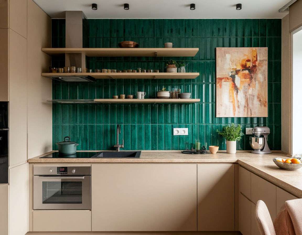 - Акцент на фартуке, отделке стены и декоре. Красивая плитка, керамогранит с выразительной текстурой, фактурная штукатурка становятся полноценным элементом дизайна, а не фоном.